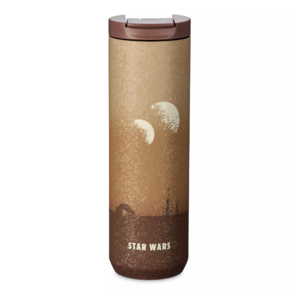 This new Starbucks water bottle also features the Tatooine landscape. It’s made of stainless steel and has a flip-up sipper lid. One side has the Star Wars logo, and the other has the Starbucks logo.
