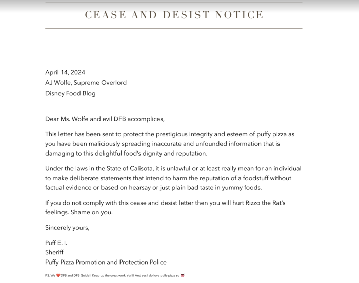And if you’re new around here — just know that not all Disney World pizza is created equally. Some pizza is worth singing about from the mountaintops, while other slices belong in the bottom of the trash. All those years of trash-talking must have finally caught up with us because we’ve officially been sent a cease-and-desist order.