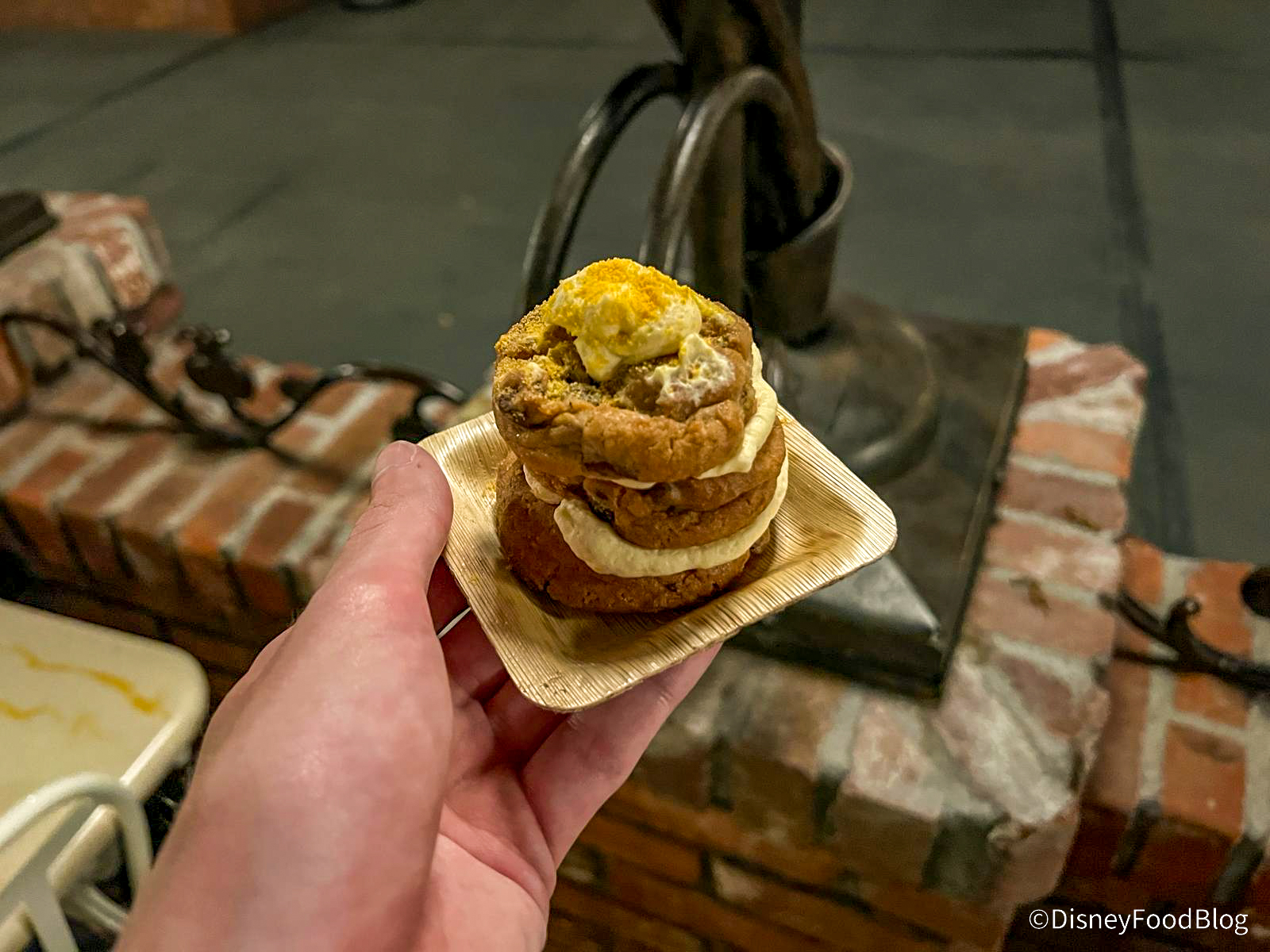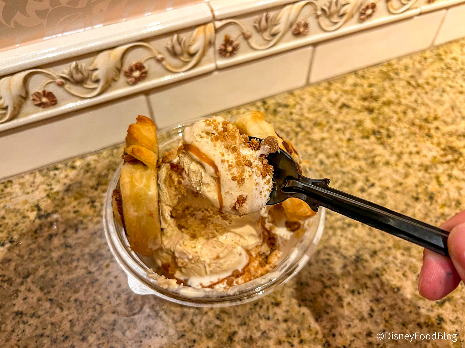 We thought this sundae was delicious! The brown sugar ice cream was sweet and had lots of cinnamon flavor. The marshmallow creme added a great sweet flavor, like the frosting on a cinnamon roll. The caramel sauce was perfect, and the streusel added a nice crunch. This is definitely a must-get dessert at Star Wars Nite.