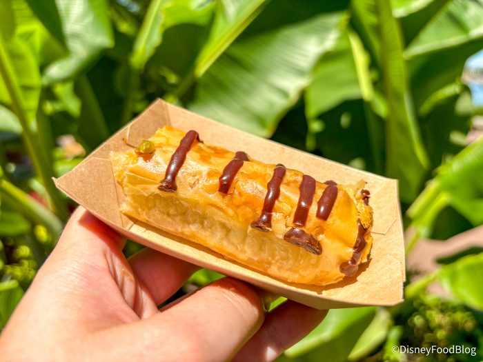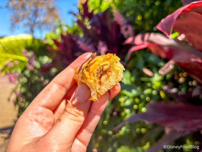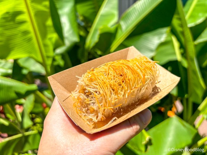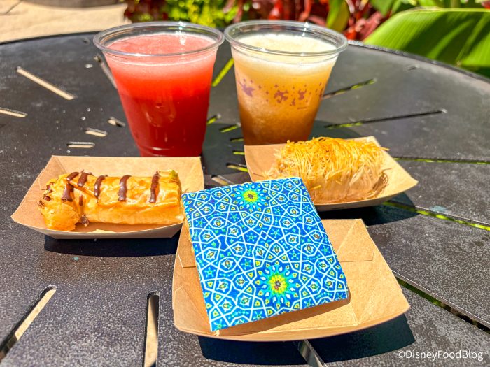 Oasis Sweet & Sips is a great stop as you are making your way around the World Showcase. The kiosk is perfect for a quick stop to please your sweet tooth. However, if you are looking for something savory, you will want to keep moving. We enjoyed everything we tried, with our favorites being the Frozen Mint Tea and Kataifi. You really can’t go wrong with anything you select from this booth, though; it was all great. We also think the Frozen Mint Tea and Frozen Citrus-Pomegranate drinks should be included in your drinking around the world quest!