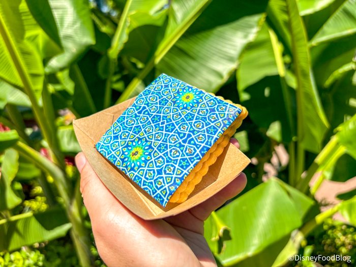 Oasis Sweets & Sips is located in the Morocco Pavilion. It is at the end of the Spice Road Table market and is a pretty small, unassuming kiosk. In fact, you may even walk right past it, not even realizing the potential it holds! There is a fair amount of seating options near the kiosk, but there isn’t any seating specifically for Oasis Sweets & Sips. You can grab a table across the way, check out Tangierine Cafe, or look around the lagoon for additional tables.
