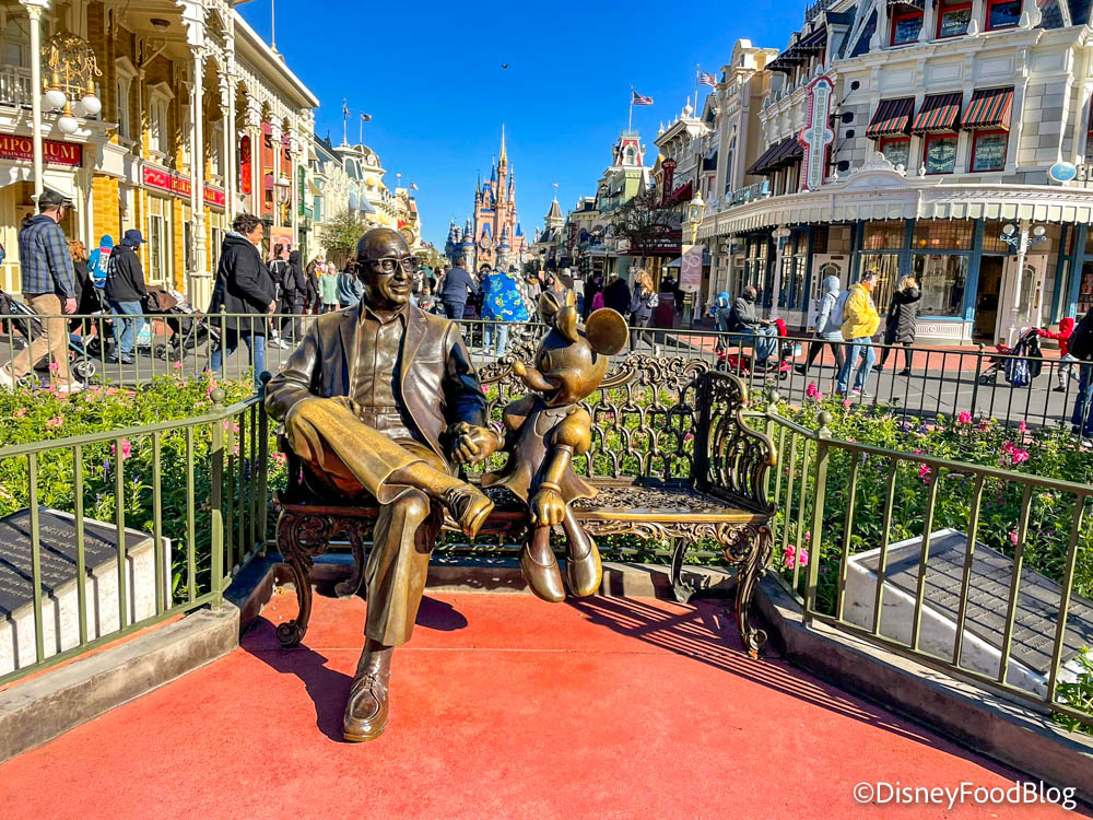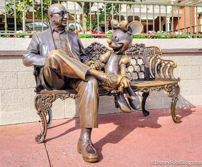 On Main Street, you can find a bench with a statue of Roy Disney and Minnie Mouse. This is a sweet tribute to Roy Disney, but some people may not know who Roy Disney is.
