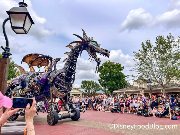 But we’re not going to eat them here. After we pick them up, we’re headed for the rocking chairs in Liberty Square that sit right on the route of the Festival of Fantasy parade (you know where we’re going with this, right?). We’re going to get comfy in one of those chairs and wait for the parade to begin.