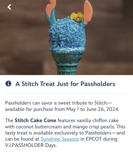 As part of the V.I.Passholder Days celebration, Disney is rolling out an exclusive new treat just for passholders! The Stitch Cake Cone will be available from May 1st to June 26th at Sunshine Seasons in the Land Pavilion at EPCOT. It’s a vanilla chiffon cake with coconut buttercream, mango crisp pearls, and Stitch’s iconic ears in a blue waffle cone! We can’t wait to try it once this passholder celebration officially kicks off, and we’re expecting even more Stitch-themed treats for 626 Day on June 26th.