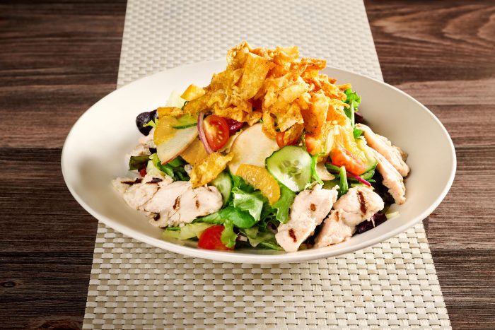 The last new dish is the Asian Salad. This salad is mesclun and baby iceberg lettuce, cucumbers, tomato, red onion, orange segment, apple, wonton chips and ginger dressing. You can get this salad for $15, with the option to add chicken for $9, oishii shrimp for $10, bulgogi beef for $10, calamari for $9, or fried tofu for $5.