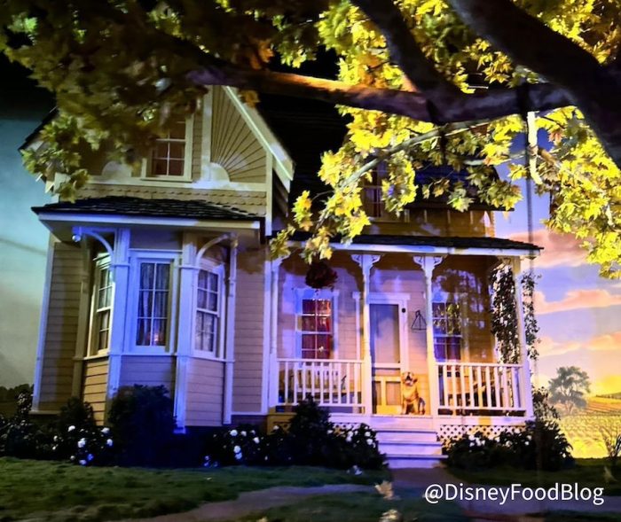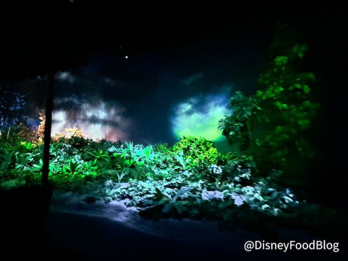 During the first half of the boat ride – an animatronic-filled trip through several recreations of biomes of Earth’s climate – we noticed some stunning new lighting that adds brightness and depth to the attraction. First up, we have a new lighting package on the American prairie house, featuring one of our favorite “good boy” animatronics at Walt Disney World!