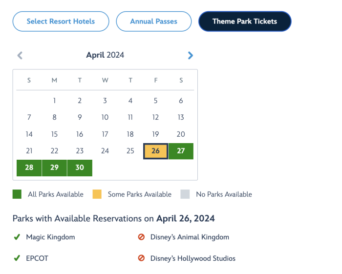 We’ve been keeping an eye on the availability of park pass reservations and we noticed something unexpected on Friday, April 26th — reservations were sold out for Disney’s Hollywood Studios and Disney’s Animal Kingdom. It isn’t necessarily unexpected to see Disney’s Hollywood Studios sold out, but since Disney’s Animal Kingdom is often the last park with reservations still available on busy days, we were surprised to see it booked up when there were still spots open for Magic Kingdom and EPCOT!