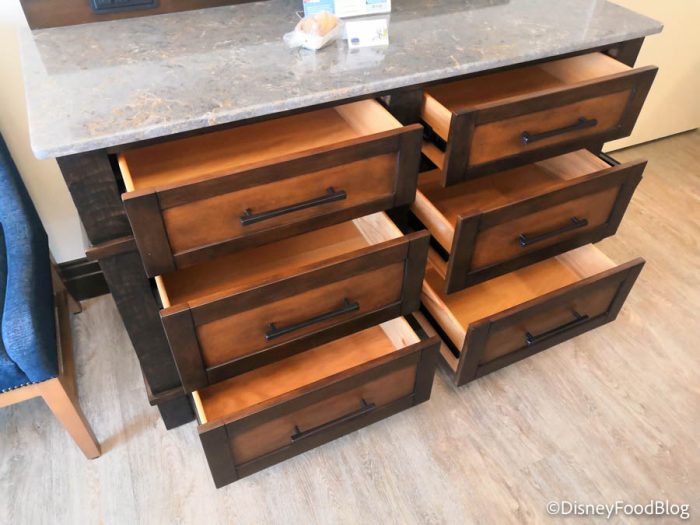 I’ve found out that this also helps save space in the room! Instead of having a bunch of clunky suitcases spread out throughout the room, my family and I can tuck them under the beds, out of the way, because all of the stuff we need is stored in the dresser and bathroom.