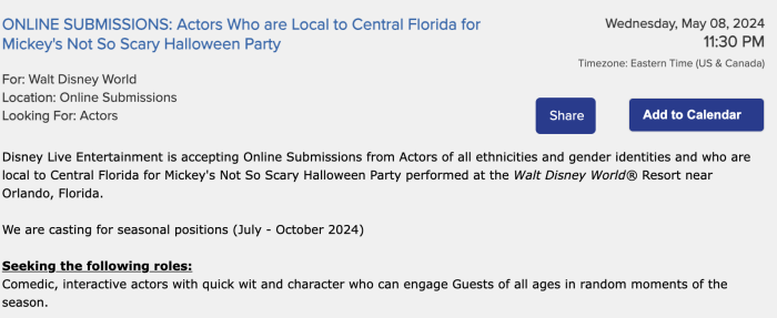 Over on the Disney Careers website, anyone can see what auditions Disney is holding for their parks and/or cruise line ships. Just recently, Disney released a few new casting calls, one of them titled “ONLINE SUBMISSIONS: Actors Who are Local to Central Florida for Mickey’s Not So Scary Halloween Party.”