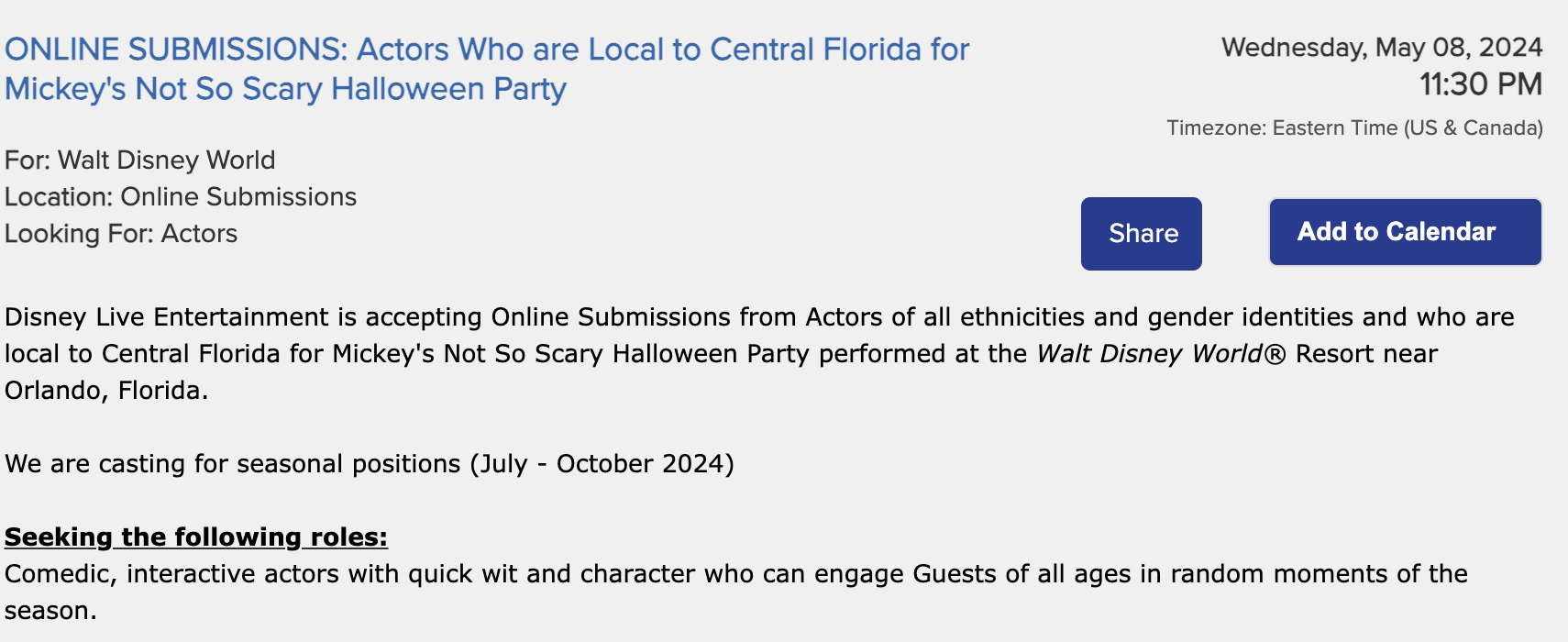 Reading further, the casting call states they’re looking for “Comedic, interactive actors with quick wit and character who can engage Guests of all ages in random moments of the season” and you can even see the monologues they’re asking you to audition with for the following characters: