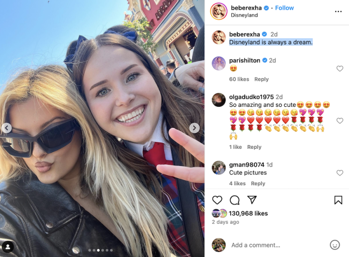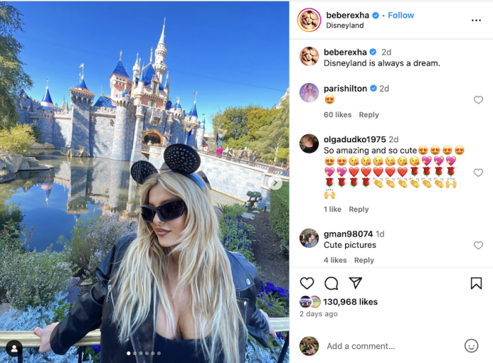 International superstar Bebe Rexha – best known for hits including “I’m Good (Blue)” (with David Guetta), “Hey Mama” (with David Guetta, Nicki Minaj and Afrojack), “Me, Myself & I” (with G-Eazy), “In the Name of Love” (with Martin Garrix), and “Meant to Be” (featuring Florida Georgia Line) – recently took to Instagram to share some snaps of a trip to the Disneyland Resort.