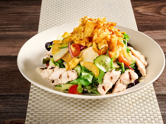 - Asian Salad – Mesclun and baby iceberg lettuce, cucumbers, tomato, red onion, orange segment, apple, wonton chips and ginger dressing. $15