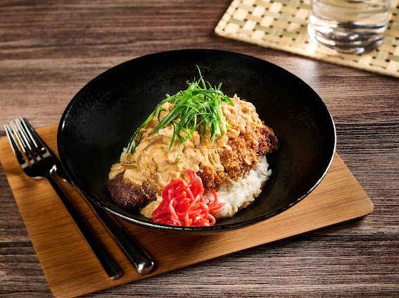 - Katsudon – Panko breaded pork skirt, dashi soy, organic egg, scallions and pickled ginger on top of house-polished white rice. $21