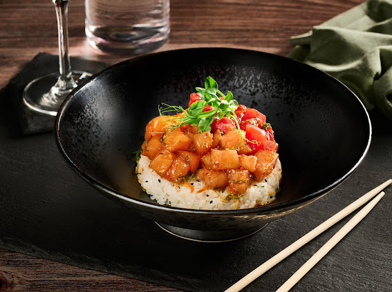- Poke Bowl – Tuna, salmon, hamachi marinated in soy, sesame, crunchy garlic chili over sushi rice. $24