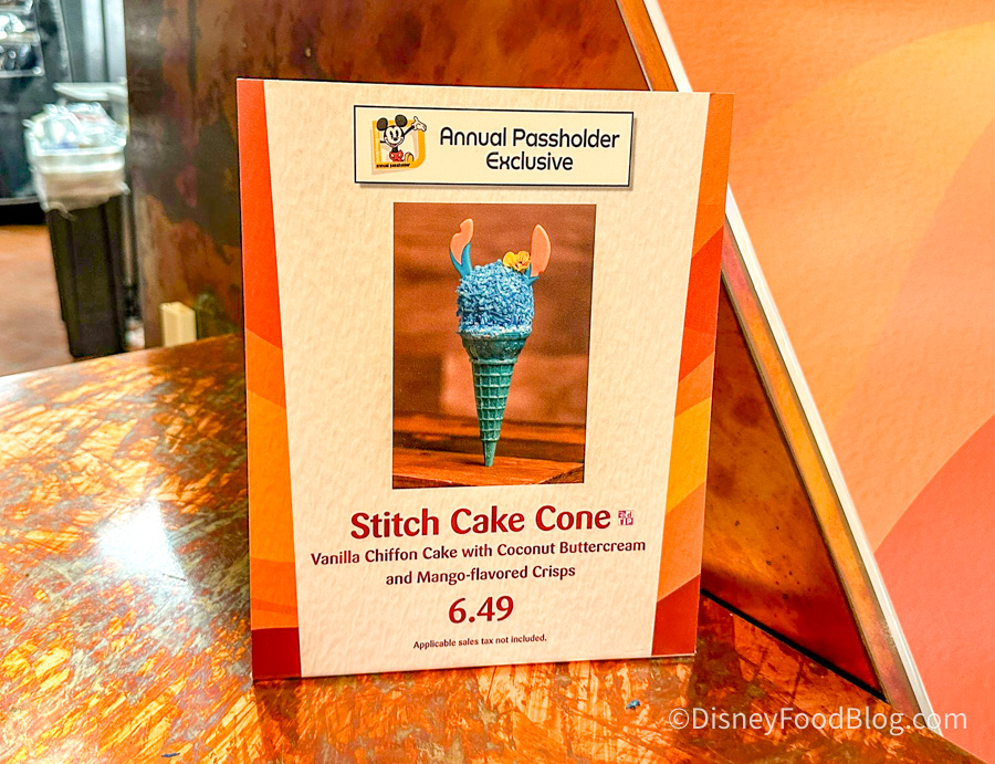 We’re trying the NEW, Annual Passholder-exclusive Stitch Cake Cone from Sunshine Seasons at EPCOT! It’s a vanilla chiffon cake with coconut buttercream, mango crisp pearls, and Stitch’s iconic ears in a blue waffle cone. You can grab it for $6.49.
