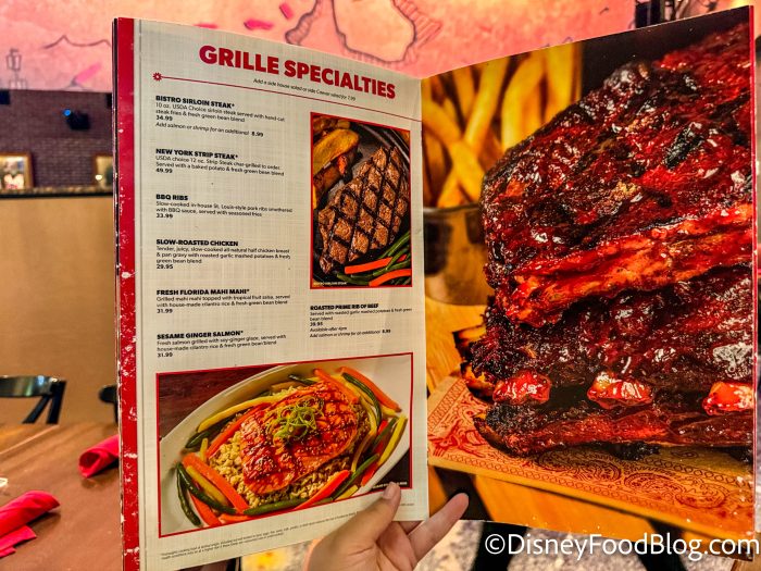 If you want something from the grille, you can choose from a selection of steak cuts, seafood options, ribs, or chicken.