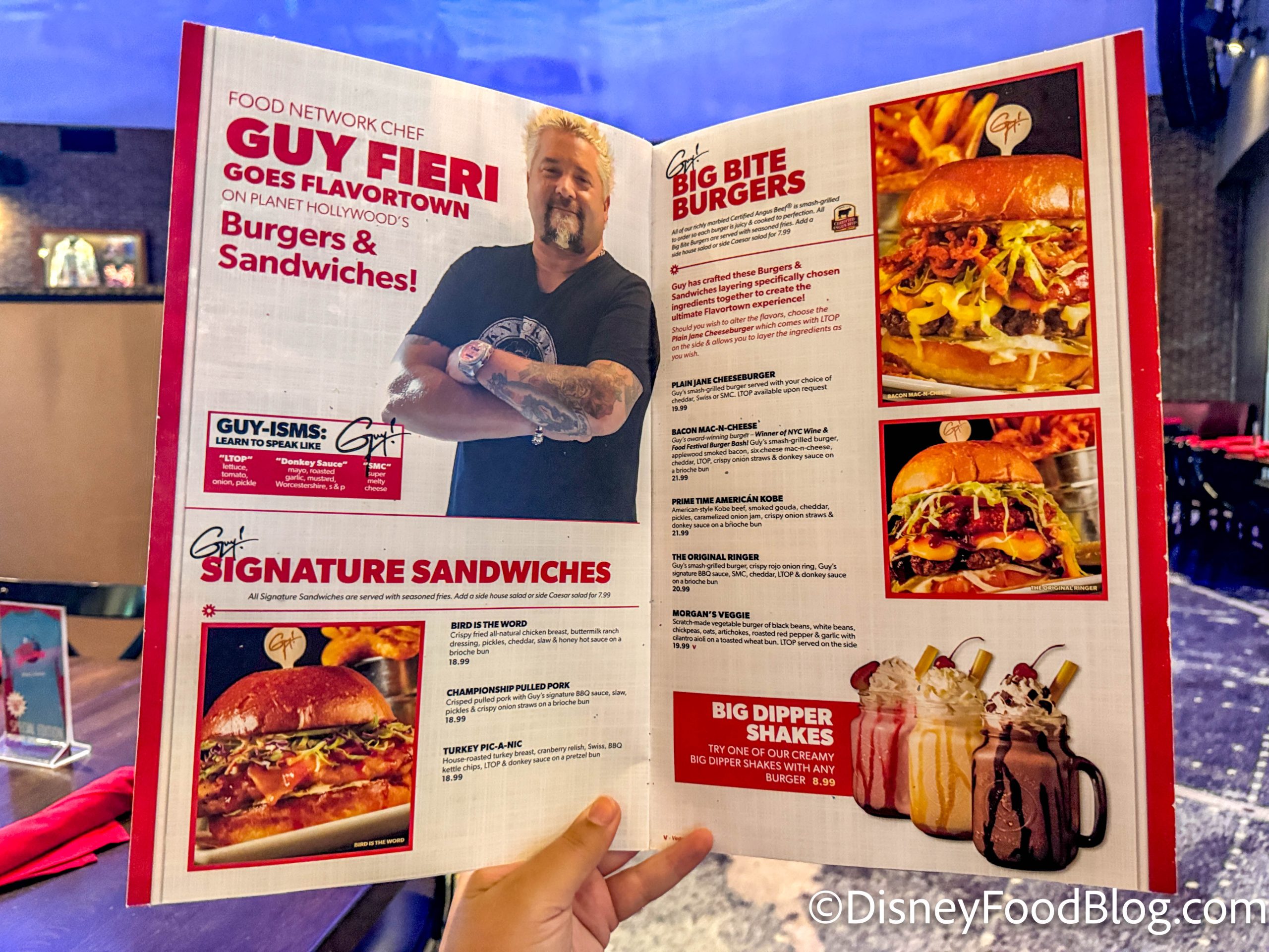 If you didn’t know, Planet Hollywood’s newest menu is a creation of Food Network star Guy Fieri, and he has curated a menu of burgers and sandwiches for the restaurant. Burgers come in varieties from Kobe beef to mac and cheese topped, and sandwiches are available in chicken, turkey, and pulled pork.
