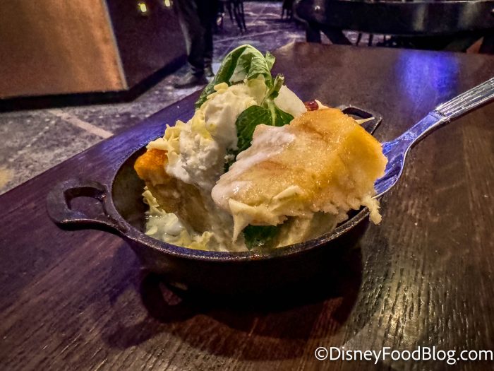 This has a really strong white chocolate flavor with vanilla and white chocolate shavings. I was really impressed that they got white chocolate to come through so accurately, since it’s a milder flavor. The bread pudding is moist and dense with just enough chew, but this would overall be better if it were served warmer.