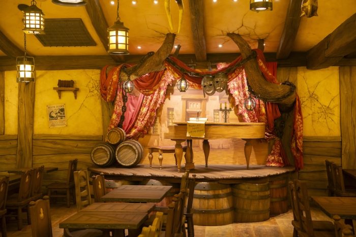 Another focal point is, of course, the STAGE. Because we ALL HAVE OUR DREAMS here at the Snuggly Duckling! The stage is held up with ale barrels and holds a rustic-looking, but still “grand” piano! The whole thing is very makeshift and depicts the scene from the movie perfectly.
