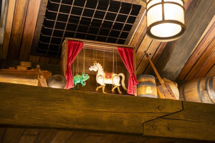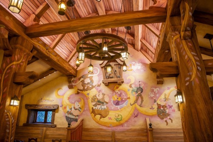 Around the beams and lanterns, you can see Rapunzel’s stamp on the place, too, of course. Look at the whimsical paintings she’s done! They kind of look like strands of her hair!