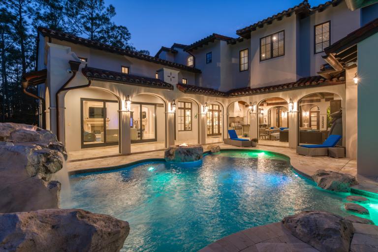 The first home, Grand Villa Amore, can be found at 10151 Enchanted Oak Drive in the Carolwood Reserve community of Golden Oak. This home boasts a whopping seven bedrooms and seven bathrooms plus two half bathrooms. It will set you back $14,500,000. It has a Mediterranean-themed design and reminds us of Prince Eric’s castle in The Little Mermaid.