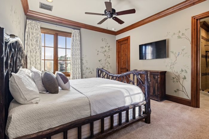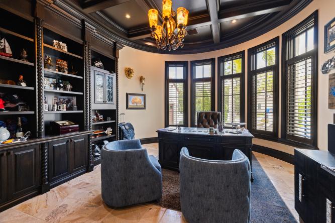 The main suite features a fireplace and a connected bathroom with a soaking tub. There’s even a pet grooming room, as well as some very impressive home office space.