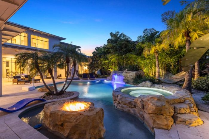 This house, though, is a little smaller: it has five bedrooms and five bathrooms with two half-bathrooms. This one also has a summer kitchen, as well as a fire pit, pool, and cabana.