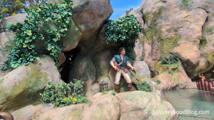The boat ride begins with an outdoor attraction featuring animatronics of Rapunzel in her tower…