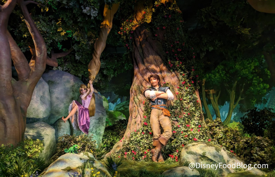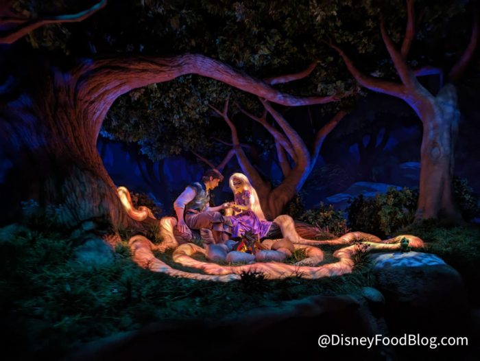 Inside, the ride continues hitting the high-points of Flynn and Rapunzel’s love story, including her winning from the trees…