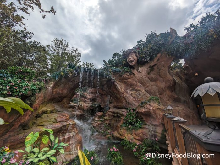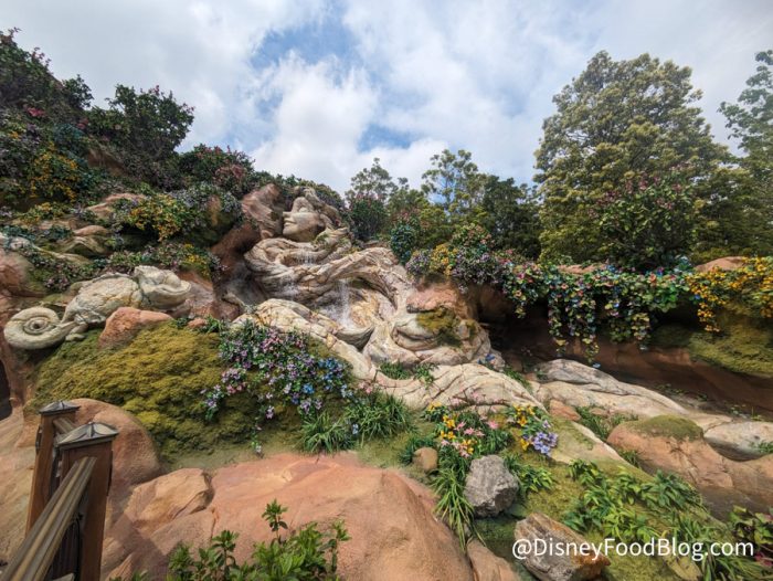There are several Disney characters hidden throughout the rockwork, including multiple princesses. We particularly loved the sculpture of Princess Aurora and Prince Philip dancing together! There’s a waterfall that cascades down the back of Aurora’s dress, and the flowers surrounding her are a mix of pink and blue, giving the illusion that her dress changes colors depending on where you’re standing.