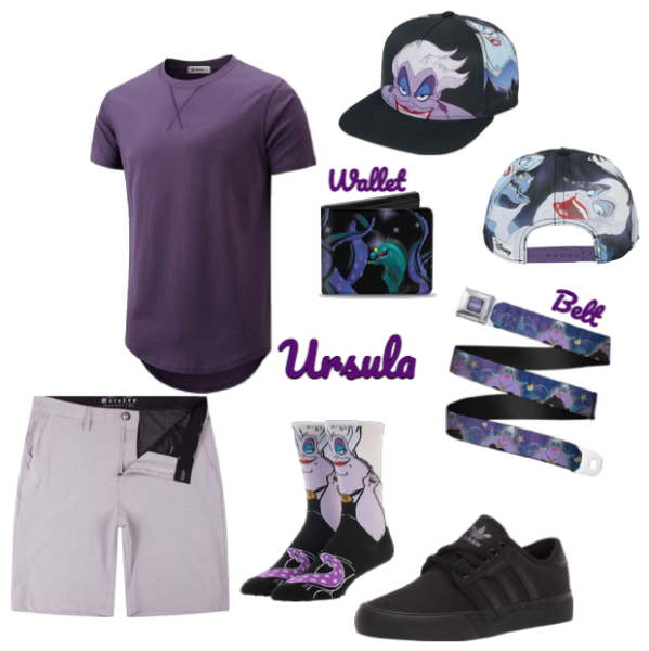 You will not be a poor, unfortunate soul as you DisneyBound Ursula with this look. Purple, white, and black are all the colors we’ll need. Start with a purple tee and white shorts. Pull up those Ursula socks and put those solid black shoes on your feet. Make sure they can’t question who you’re DisneyBounding as by rocking a matching Ursula hat, belt, and wallet.