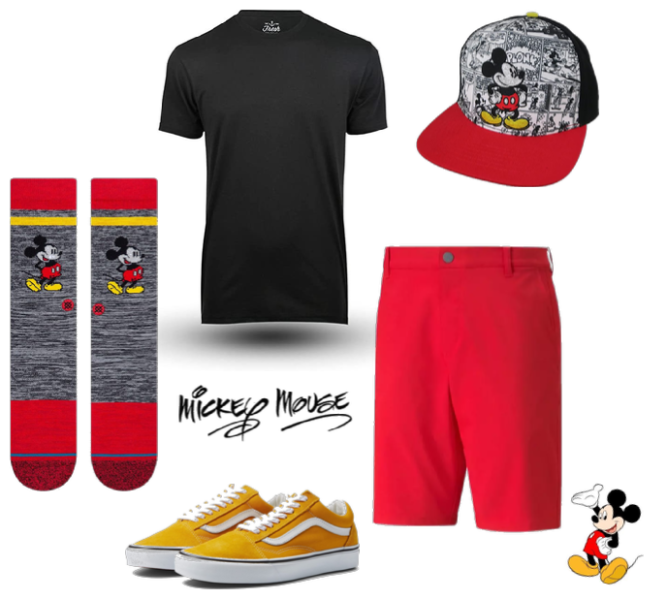 It’s time to represent the boss himself — Mickey Mouse. You bet we’re going to lean into the black, red, and gold for this one. Start with a solid black tee and Mickey-approved red shorts. Make sure to pull those Mickey crew socks all the way up and lace the gold kicks up. Finish it off with a Mickey cap.