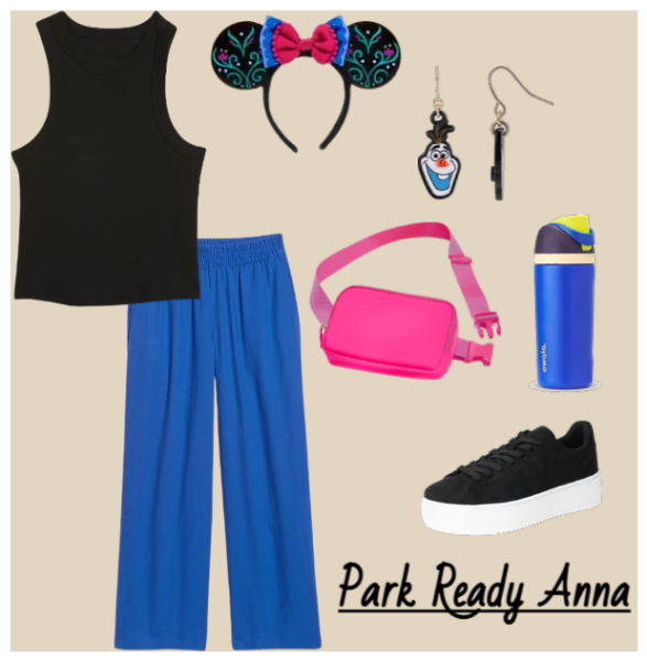 It’s time to embrace Arendelle’s adventurous spirit by starting your look with a black cropped tank top and blue high-waisted linen-blend wide-leg pants. Dangle your Olaf earrings from your ears and position your Anna ear headband perfectly on your head. Snap that pink belt bag on. Lace-up your favorite black kicks. And don’t leave home without your matching blue reusable water bottle. Gotta stay hydrated!
