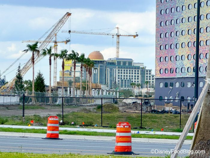 Granted, we can’t get TOO close to the construction, but we still saw progress on the hotels being built near Epic Universe. Universal Stella Nova Resort along with Universal Terra Luna Res0rt will “place guests in the center of marvelous galaxies and diverse planetary elements for an experience unlike anywhere else in the universe – complete with tranquil sleeping accommodations, entertaining amenities for the whole family to enjoy, various cosmic-inspired dining options and so much more.” Here’s the concept art: