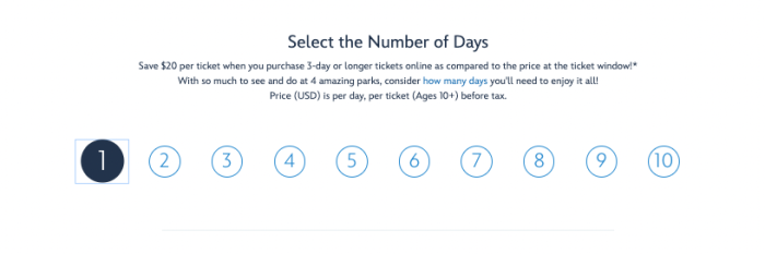 Disney has incentivized going to the parks for more days by decreasing the price of a park ticket per day the longer you stay. Sounds nice at first. But just wait until we break things down: