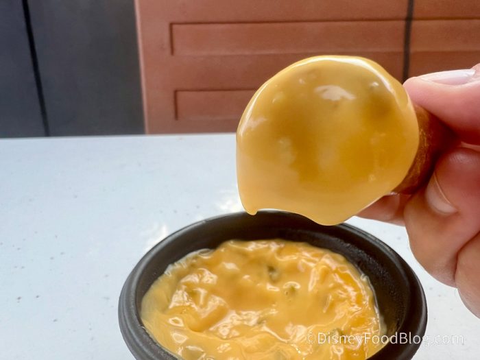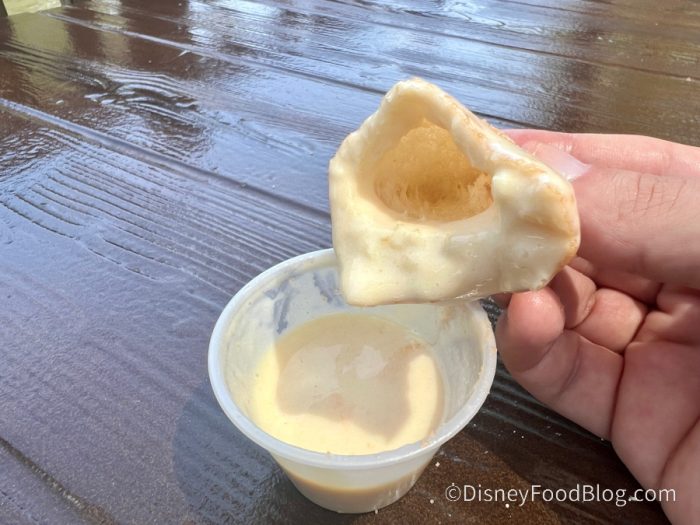 Each order comes with two mini pretzels and spicy nacho cheese. We are sad to report these let us down. There was nothing out of the ordinary about the pretzels other than their size, and the jalapeno-infused cheese felt like all it provided was heat to a bland pretzel. The pretzels themselves were fine on their own but went stale quickly and didn’t positively differentiate from a regular Mickey-shaped pretzel.