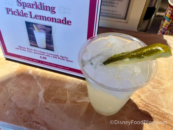 Over at Refreshment Corner on Main Street, U.S.A., we tried the Sparkling Pickle Lemonade for $6.99. This drink is made with Minute Maid® Zero Sugar Lemonade, Sprite®, and pickle juice, garnished with a dill pickle spear.