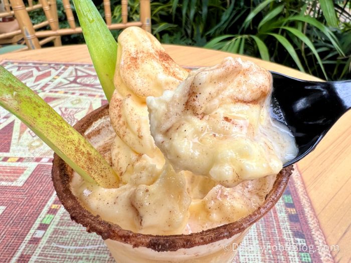 This float will set you back $8.49 and is served with pineapple-ginger juice and a smoked salt-spiced rim. We liked this drink quite a bit! The mint was pretty subtle although stronger at the bottom, so we recommend giving it a little stir. The spiced rim was good but it did add a little oomph to the float, so that could cause it to be a bit divisive. It mostly tasted like a regular pineapple whip but with that kick from the spice, which also gave an extra dimension to the pineapple chunk — almost like it was baked.