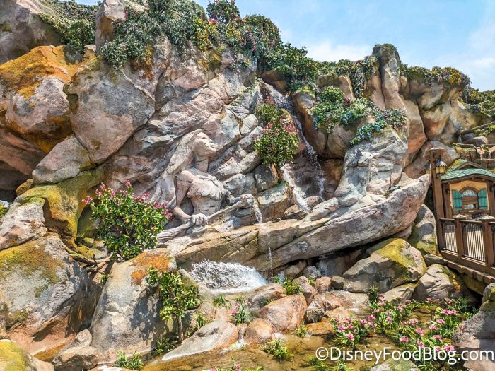 We never had “admire rockwork for hours” on our Disney list, but here we are. Y’all. The rockwork leading into Fantasy Springs from the new hotel is some of the most beautiful we’ve ever seen. You know how the Tree of Life in Animal Kingdom has animals cleverly carved into it? Well, the rockwork in Fantasy Springs has PRINCESSES CARVED INTO IT.