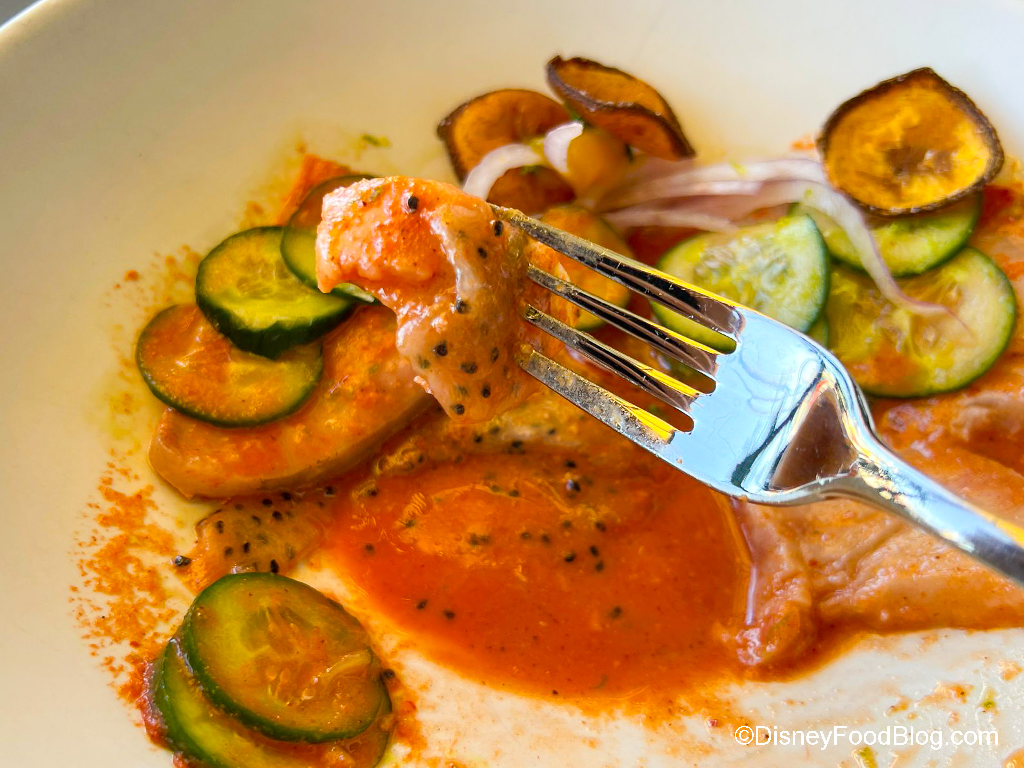 The mango habanero geleé adds a nice, sweet, and refreshing, yet slightly spicy, kick to the dish. The dragon fruit under the fish was a nice surprise and added a hint of sweetness to every bite with the fish. The cucumbers had a nice crunch and a nice saltiness that balanced out everything.