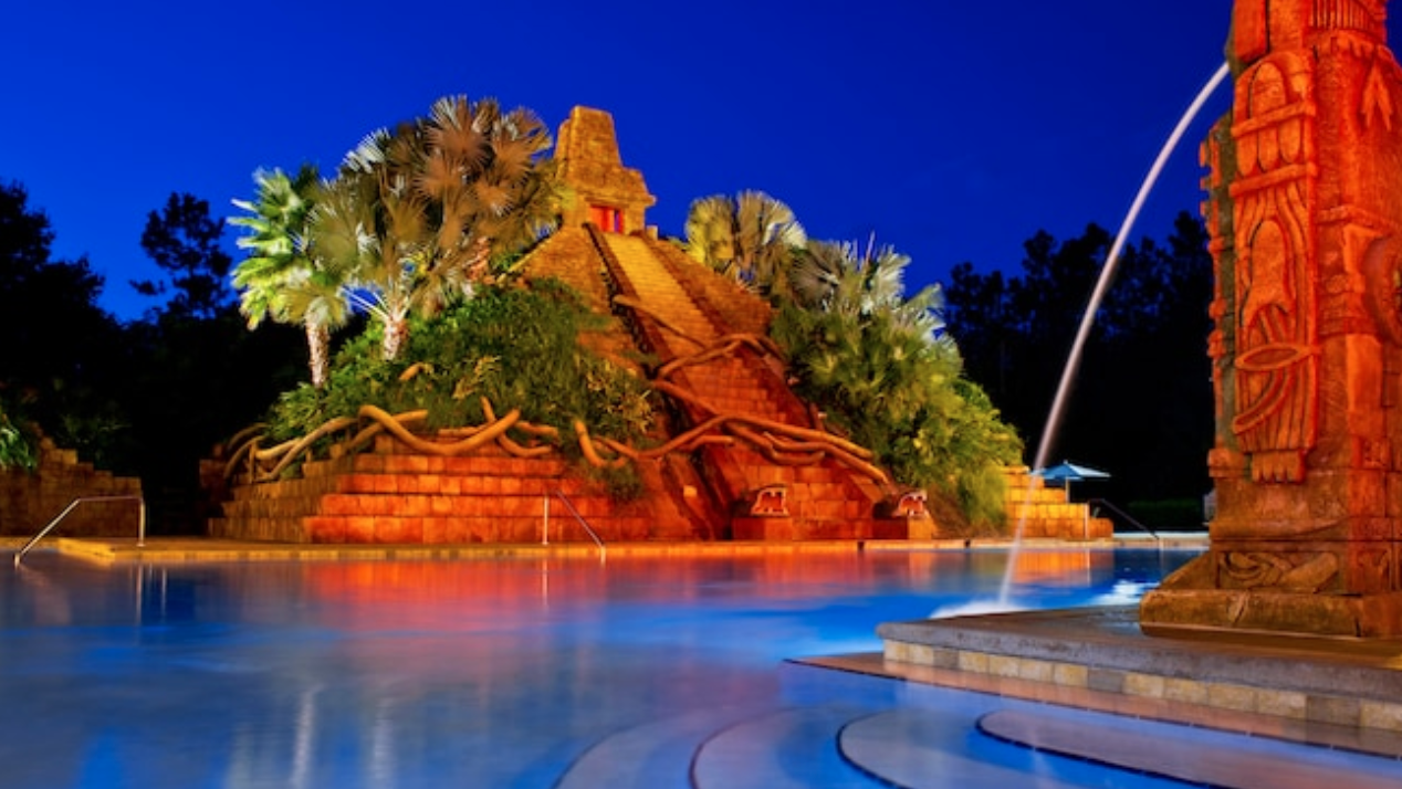 Disney describes the Coronado Springs Dig Site as “a sprawling pool complex with a Mayan ruins theme.” Here, you can enjoy the Lost City of Cibola pool, with a 50-foot pyramid centerpiece. A 123-foot-long waterslide, complete with a spitting Jaguar spirit animal, is one of the main attractions in this area.