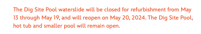 According to Disney, “The Dig Site Pool waterslide will be closed for refurbishment from May 13th through May 19th, and will reopen on May 20th, 2024.” The Dig Site Pool, hot tub, and smaller pool will remain open, though.