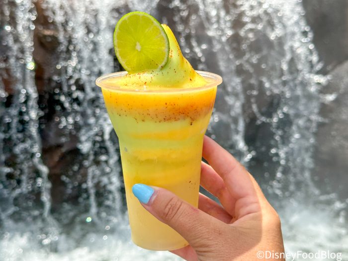We’ll start with arguably the most interesting of the 3 treats — the Dole Whip Margarita Float. This treat is a combination of mango and lime swirled Dole whip flavors topped with chili-lime seasoning and diced mango floating in a cup with a lime-flavored margarita and garnished with a lime slice for $17! Everything about this float WORKS beautifully!It’s a head-turner for sure because of all the bright colors combined to bring this float to life. It’s refreshing and a blast of citrus to your taste buds. It tastes just like you would expect a lime and mango swirl of Dole Whip would, but it’s so much more too.