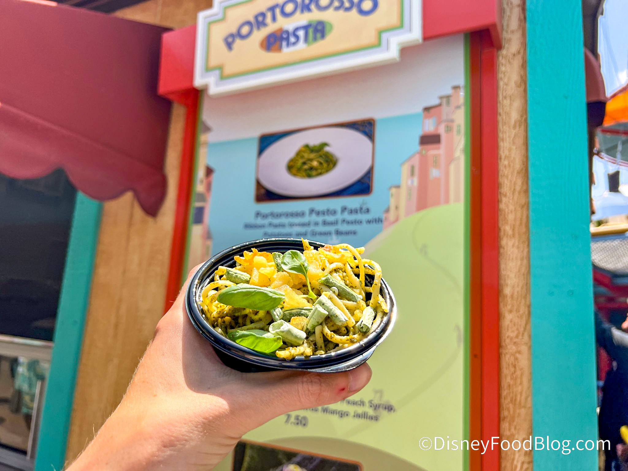 Pixar Fest includes lots of entertainment in both parks, including fireworks, a parade, and even dance parties. But we are so excited for the food this year! Now, it’s time for some pasta and Italian eats at the Portorosso Pasta booth at Disney’s Pixar Fest. This booth is inspired by the film Luca— let’s check it out!