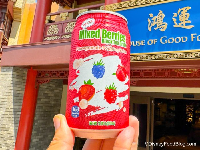 Well, we just found a DUPE in the most unexpected place — the China Pavilion at EPCOT. We were checking out some new merchandise at House of Good Fortune and came across a Mixed Berries Black Tea Drink with Pomegranate Popping Boba in a can. We just HAD to try it out!