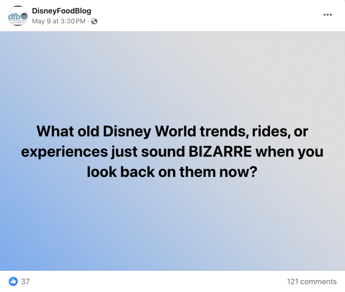 We reached out to our followers on Facebook to ask: “What old Disney World trends, rides, or experiences just sound BIZARRE when you look back on them now?” We had quite a few people leave their opinions in the comments!