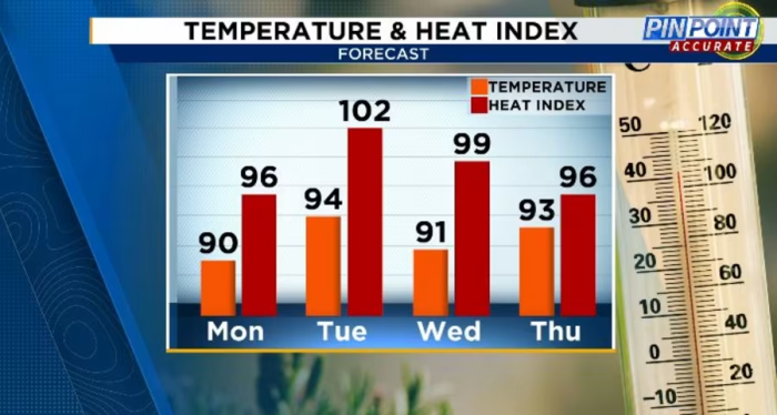 The heat is expected to feature highs of mid- to low 90s and peak heat indices between 100-105 degrees in the afternoon hours, according to News 6. Lows are expected to remain in the upper 60s to low 70s in the evenings.