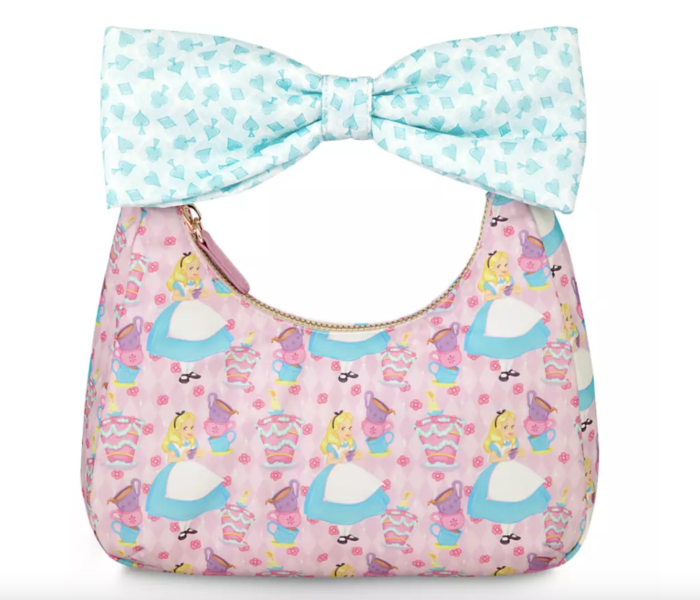 This bag is just begging to be part of a Disneybound ensemble. The pattern shows Alice, toppling teacups, and unbirthday cakes, and the large bow handle is covered in hearts, clubs, spades, and diamonds.