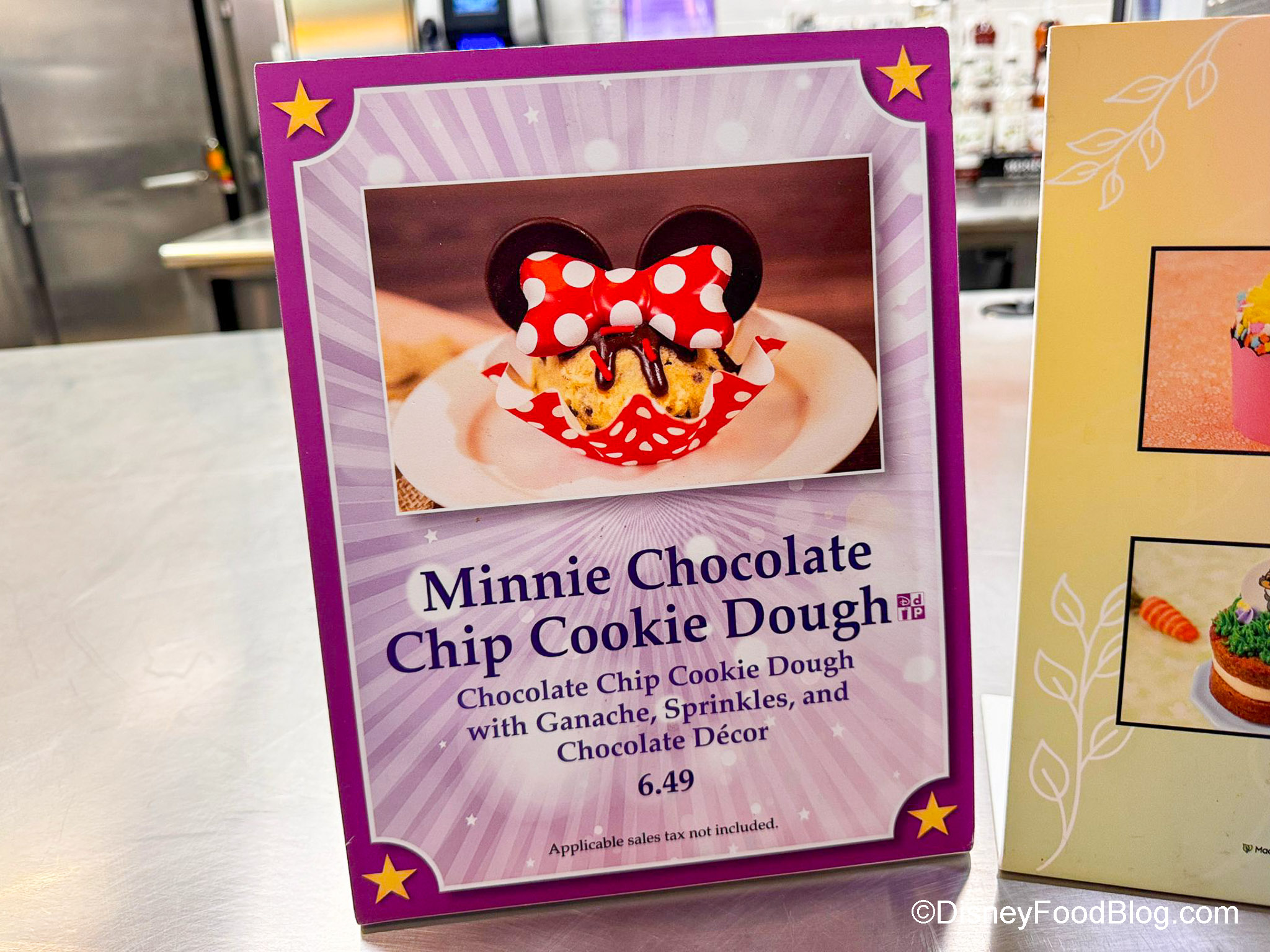 So, we recently made a special trip to Disney’s All-Star Music Resort with one specific mission on our minds. A quick visit to Intermission Food Court turned up something VERY interesting: Minnie Chocolate Chip Cookie Dough. Okay, color us VERY intrigued. We’ve seen similar cookie dough treats in Disney World in the past, but we were pretty excited to see this sweet menu addition.