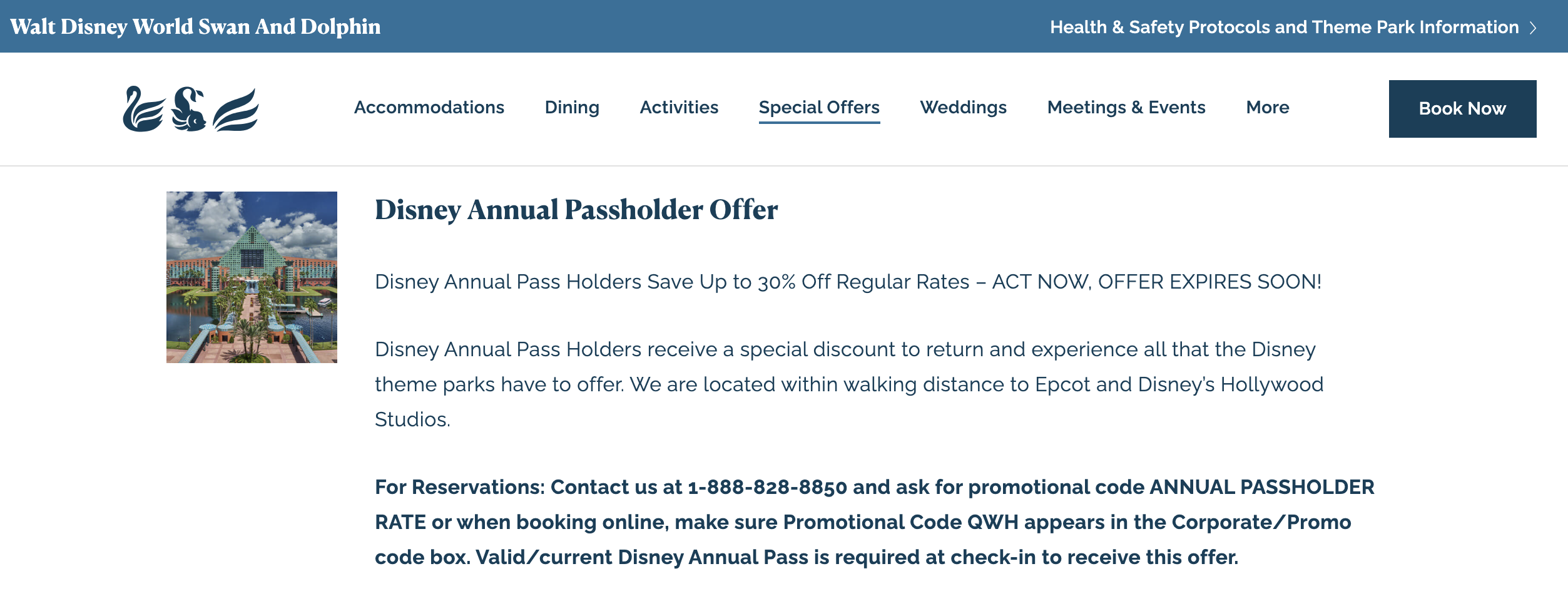 For Reservations: Call 1-888-828-8850 and ask for promotional code ANNUAL PASSHOLDER RATE or when booking online, make sure Promotional Code QWH appears in the Corporate/Promo code box. (A valid/current Disney Annual Pass is required at check-in to receive this offer.)